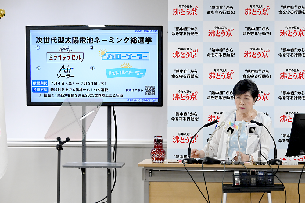 | 2025年7月4日 | 1 暑さ対策 2 次世代型太陽電池ネーミング総選挙 3 新宿駅周辺のまちづくり 4 中高生職業体験募集 5 太陽フレア |