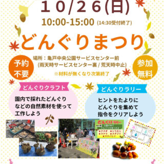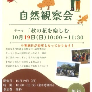 My TOKYOイベント・体験【猿江恩賜公園】自然観察会実施のお知らせ【今月は19日開催となります】今月の自然観察会は19日(日)に開催となっております。ご注意ください。 テーマは「秋の花を楽しむ」を予定しております。 皆様のご参加をお待ちしております。