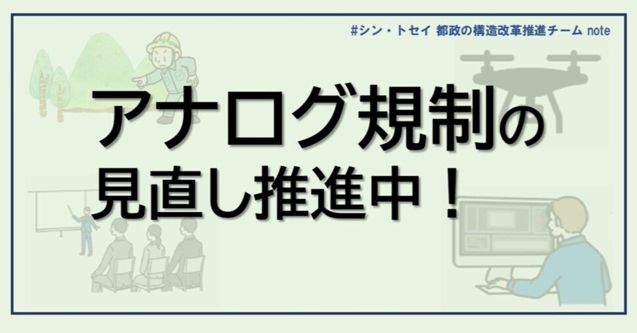 My TOKYOデジタル・最新技術2025年度末を目途にアナログ規制の見直しを推進中!【デジタル社会の実現】東京都では、2022年度から都民や事業者のみなさまの行政サービスの利便性向上のため、アナログ規制の見直しを進めています。 また、国においても、2022年7月から2024年6月までの2年間を集中改革期間とし、デジタル社会の実現を目指し、アナログ規制の見直しを行っています。都も国や他自治体の見直し事例を庁内各局に紹介するなどして、取組のさらなる加速化を進めています。