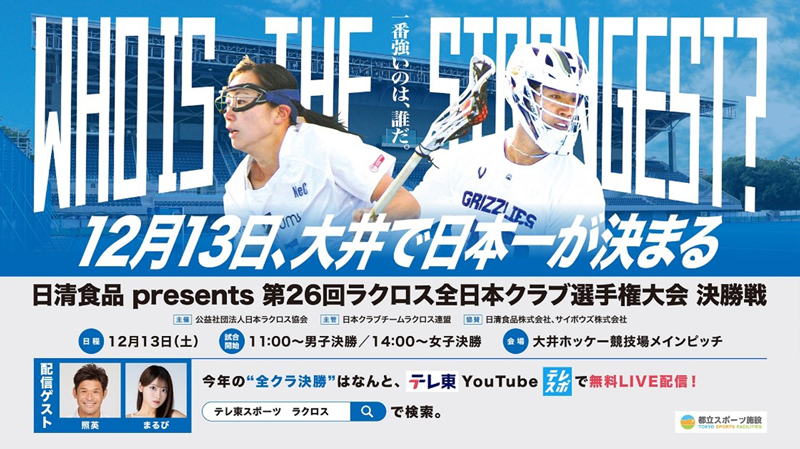 2028年ロサンゼルスオリンピックで120年ぶりに復活! 第26回ラクロス全日本クラブ選手権大会決勝戦(男子・女子)を12月13日(土曜日)ライブ配信します!東京都と公益財団法人東京都スポーツ文化事業団は、東京2020オリンピック・パラリンピック競技大会のレガシーである大井ふ頭中央海浜公園ホッケー競技場で12月13日(土曜日)に行われる「第26回ラクロス全日本クラブ選手権大会」決勝戦(男子・女子)2試合のライブ中継配信を実施いたします。https://www.my.metro.tokyo.lg.jp/w/118-20251202-221654850My TOKYO