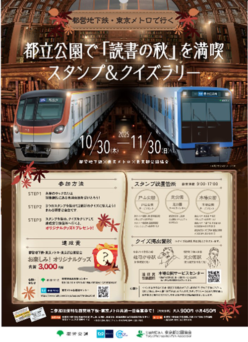 都営地下鉄×東京メトロ×東京都公園協会 「都営地下鉄・東京メトロで行く都立公園で「読書の秋」を満喫スタンプ&クイズラリー」を実施!交通局(東京都新宿区、交通局長:堀越弥栄子)、東京地下鉄株式会社(本社:東京都台東区、代表取締役社長:小坂彰洋、以下「東京メトロ」)、建設局(東京都新宿区、建設局長:花井徹夫)、公益財団法人東京都公園協会(本社:東京都新宿区、理事長:矢岡俊樹、以下「東京都公園協会」)は、都営地下鉄×東京メトロ×東京都公園協会「都営地下鉄・東京メトロで行く都立公園で「読書の秋」を満喫スタンプ&クイズラリー」を2025年10月30日(木曜日)から11月30日(日曜日)まで合同で実施します。https://www.my.metro.tokyo.lg.jp/w/000-20251016-194353458My TOKYO