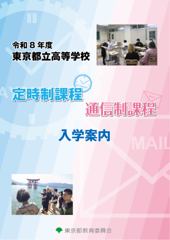 令和8年度東京都立高等学校定時制課程通信制課程入学案内東京都立高等学校の定時制課程・通信制課程への入学を希望する皆さんのために、「令和8年度入学案内」を作成しました。 この案内には、定時制・通信制の特徴をはじめ、入試の日程や学校生活の雰囲気、各学校からのメッセージなどを掲載しています。 定時制・通信制には、多様な学びのスタイルや時間の選択肢があり、それぞれの状況に応じて学習を進めることができます。自分の進路を考えるうえで、この入学案内が新たな一歩を踏み出すための参考となれば幸いです。https://www.kyoiku.metro.tokyo.lg.jp/admission/high_school/exam/pamphlet2026_parttime教育庁