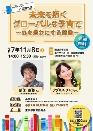 子供読書活動の推進に向けて トークイベント「未来を拓くグローバルな子育て 心を豊かにする読書」開催このたび東京都教育委員会では、子供読書活動の推進に向けた取り組みとして、歌手でエッセイストのアグネス・チャンさんをお招きし、都立図書館名誉館長の尾木ママとのトークイベントを国連大学を会場に、開催いたします。https://www.my.metro.tokyo.lg.jp/w/000-20251003-186830821My TOKYO
